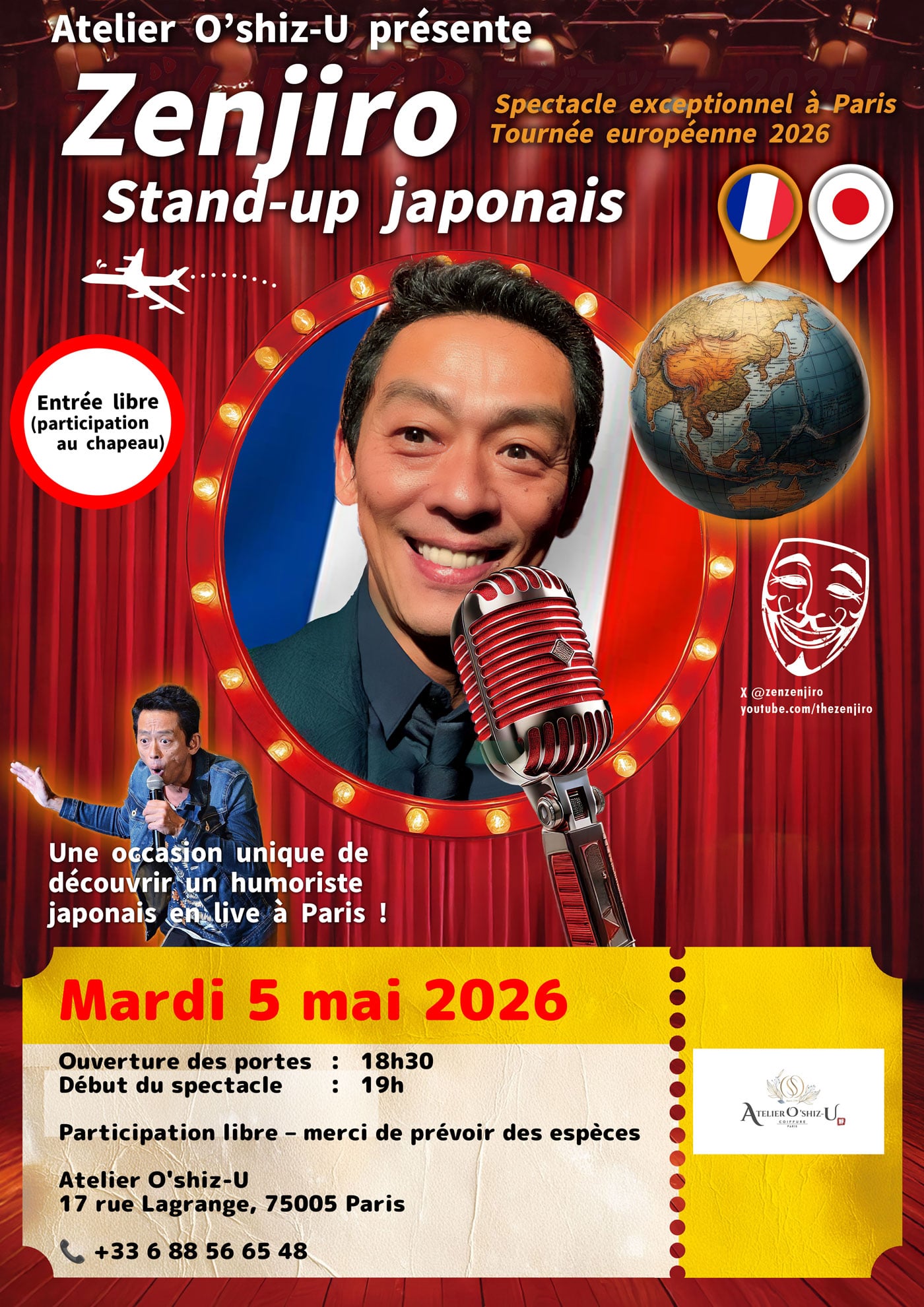 なんと…‼️Atelier Oshiz-Uオープン7週年を終えようとしている5月、初めての試みです!世の中は時代の変革期にいて、私たちは不安の中にいます。これから世の中はどうなっていくんだろう?けど、こうやって時代は作られ、歴史は積み重なってきたんですよね。そんな中、いろんなモヤモヤに毎日を過ごされている皆さんに是非、笑いで自分をいらして欲しいと思い、企画しました。なんと、日本からコメディアンのぜんじろう さんをお迎えしてサロン内で特別イベントを開催します🇯🇵✈️普段なかなか体験できない“笑い”と“空気感”を間近で感じられるチャンス✨ぜひ、皆さんに思いっきり笑っていただきたい!!! ここでしか味わえない時間を一緒に過ごしませんか?😊 📅日程:2026年5月5日📍場所:Atelier Oshiz-U内 17 rue Lagrange 75005 Paris🎫詳細・ご予約はDMまたはSNS (0688566548) 、または店頭まで 席に限り(30席)がありますのでお早めに💫笑いたい方全員集合!!! 皆さまのご参加お待ちしております✨ ...